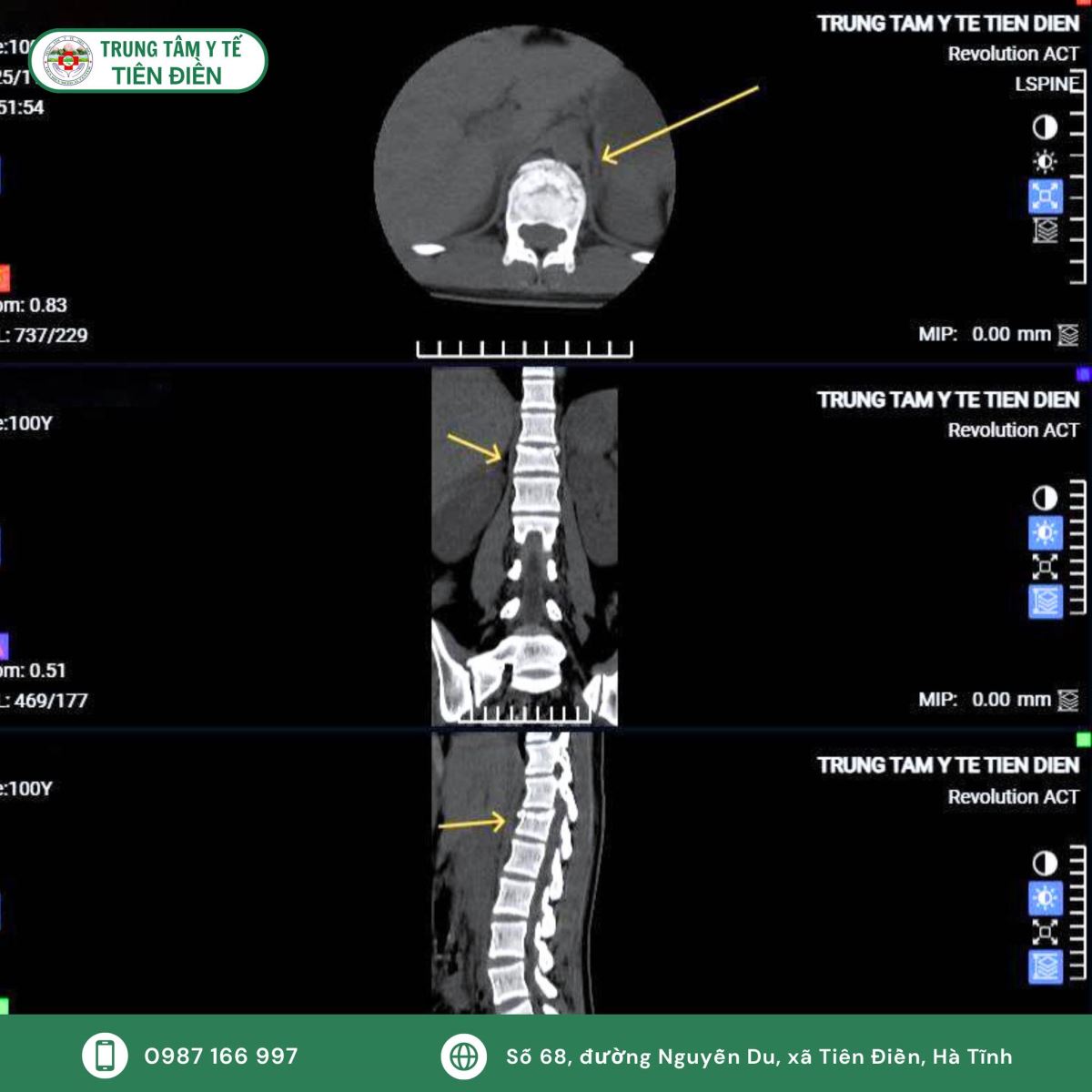 Bệnh nhân được khám và chẩn đoán sơ bộ ban đầu Chấn thương cột sống lưng do tai nạn giao thông. Sau khi sơ cấp cứu, bệnh nhân được chỉ định chụp cắt lớp vi tính (CT) cột sống thắt lưng. Kết quả cho thấy: