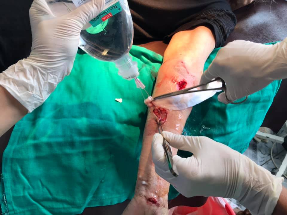 Qua kiểm tra thấy bệnh nhân có gần… 30 vết thương lớn, nhỏ vùng mông lưng, đùi và cẳng tay trái. Trong đó có 4 vết cắn nặng nhất ở vùng cẳng tay bên trái dài khoảng 10 cm, tổn thương đứt một phần cơ gấp cánh tay trái , một vết cắn ở mặt sau khuỷu tay dài khoảng 15cm, sâu 3cm. Bệnh nhân đã được các BS nhanh chóng khâu cầm máu, phục hồi cân cơ, dùng thuốc kháng sinh, thuốc chống phù nề và tiêm phòng uốn ván.