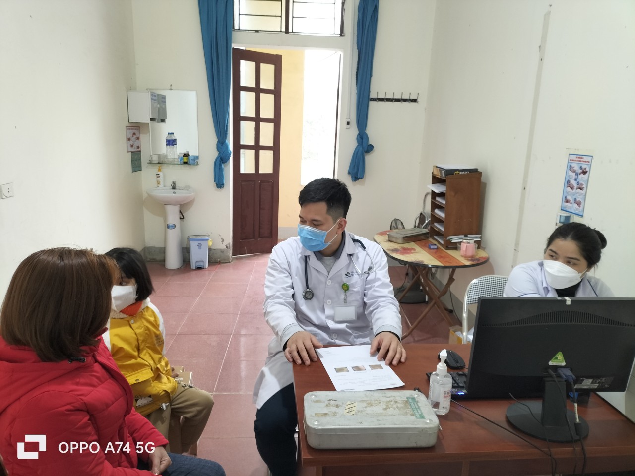 Thạc sỹ, bác sỹ Bùi Đức Vũ khám cho các bệnh nhi tại Trung tâm Y tế huyện Nghi Xuân sáng ngày 02/02/2023