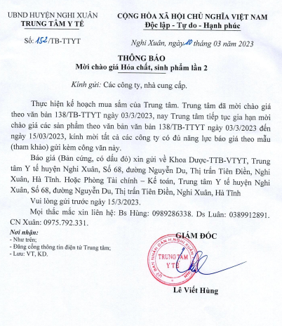| TRUNG TÂM Y TẾ HUYỆN NGHI XUÂN MỜI CHÀO GIÁ HÓA CHẤT, SINH PHẨM LẦN 2