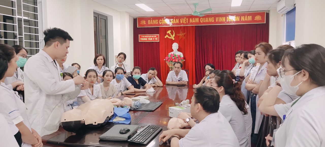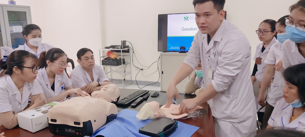 Tại buổi tập huấn, các học viên đã được Ths.Bs Bùi Đức Vũ Khoa Cấp cứu - Chống độc Bệnh viện Nhi Trung ương cập nhật các kiến thức về cấp cứu cơ bản và quy trình đặt nội khí quản, hướng dẫn trên mô hình các kỹ thuật liên quan.