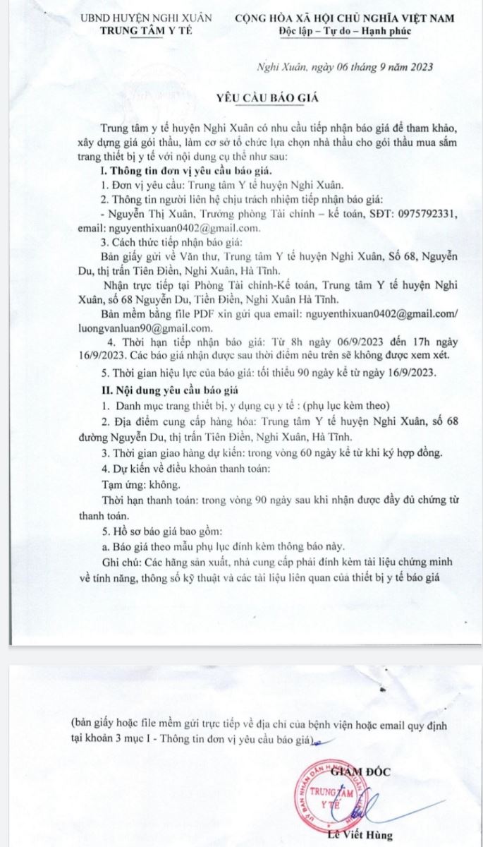 Trung tâm Y tế huyện Nghi Xuân yêu cầu báo giá trang thiết bị y tế