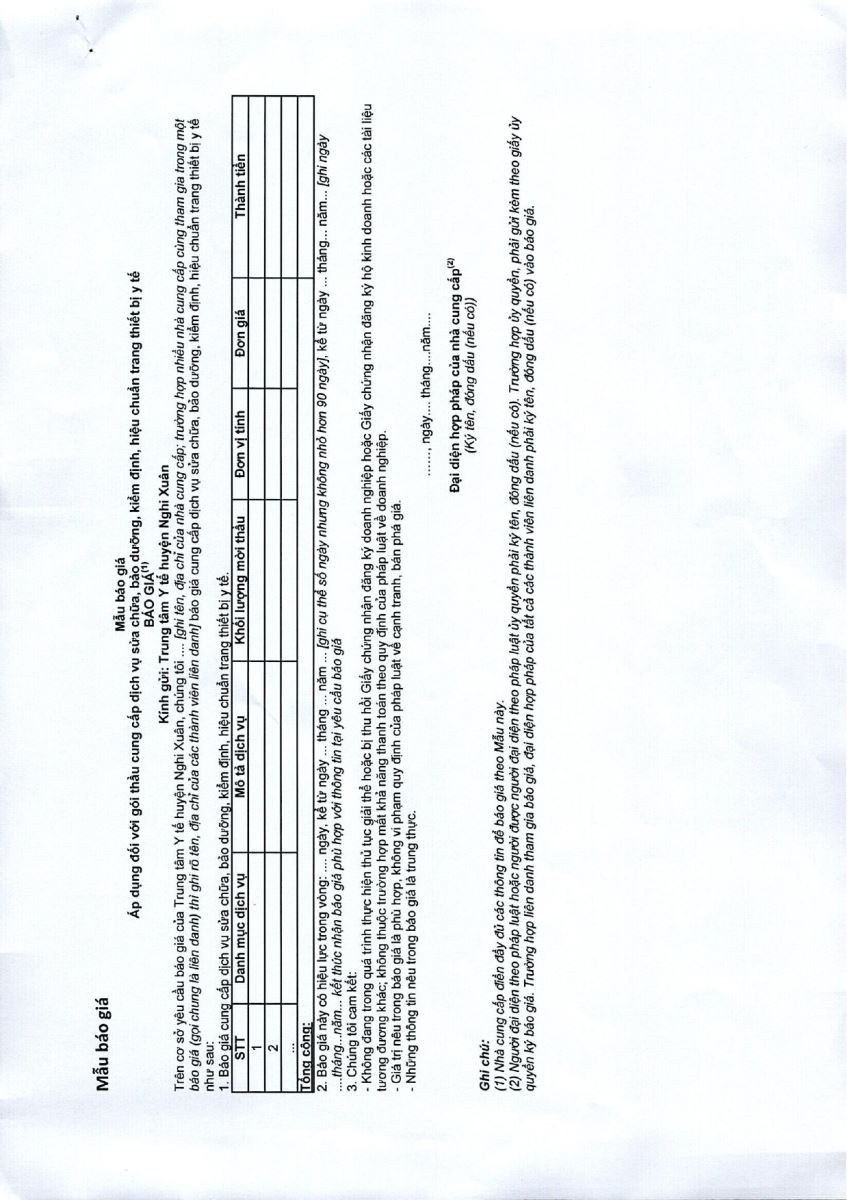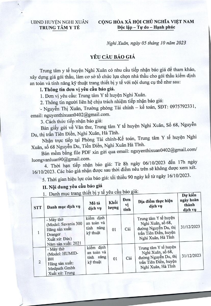 Trung tâm y tế huyện Nghi Xuân có nhu cầu tiếp nhận báo giá để tham khảo, xây dựng giá gói thầu, làm cơ sở tổ chức lựa chọn nhà thầu cho gói thầu kiểm định an toàn và tính năng kỹ thuật trang thiết bị y tế, cụ thể như sau