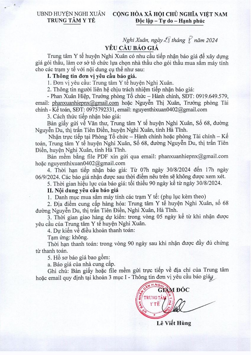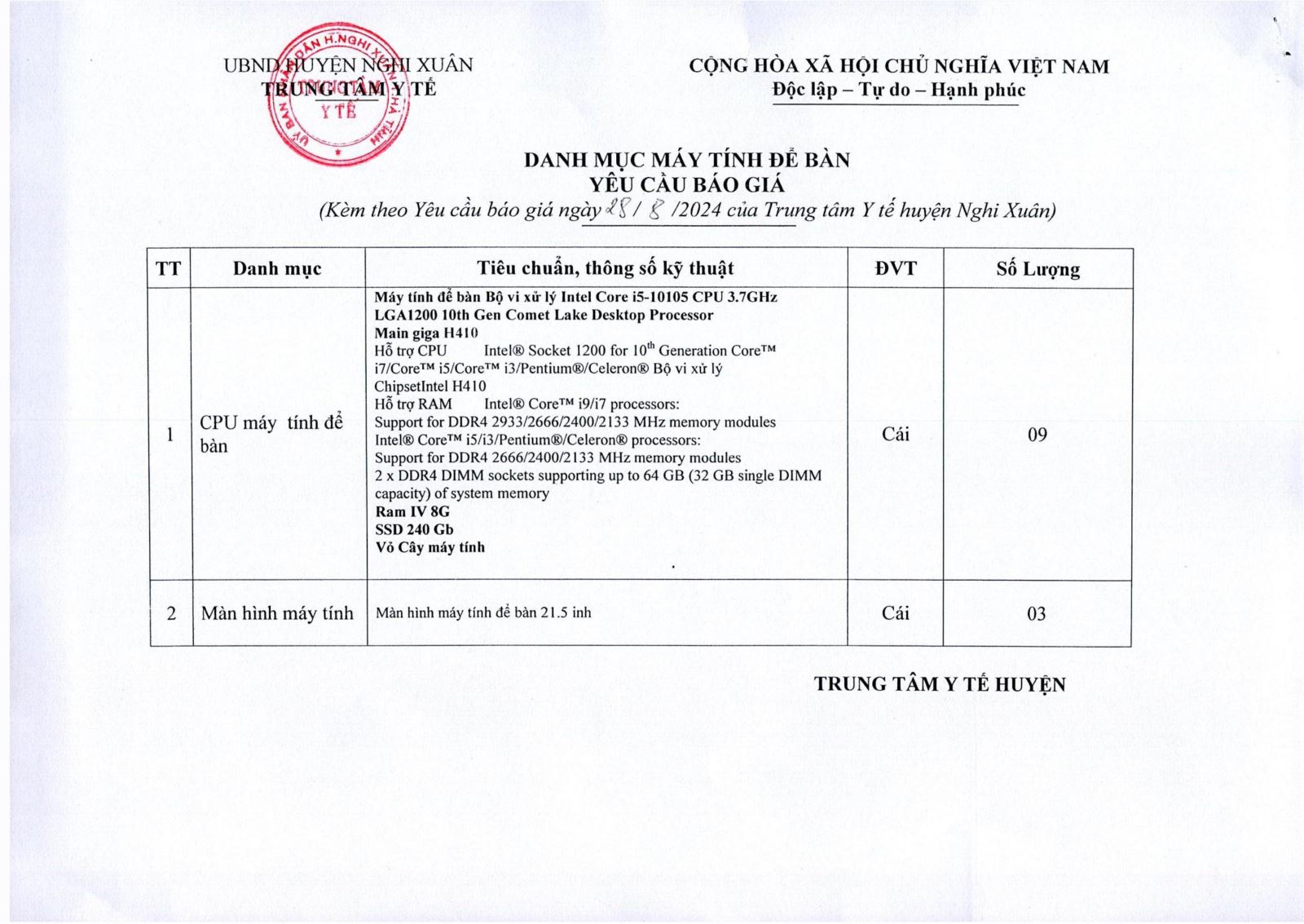 Trung tâm y tế huyện Nghi Xuân có nhu cầu nhận báo giá để xây dựng gói thầu mua sắm máy tính
