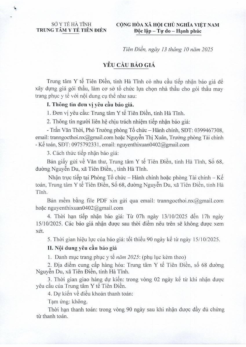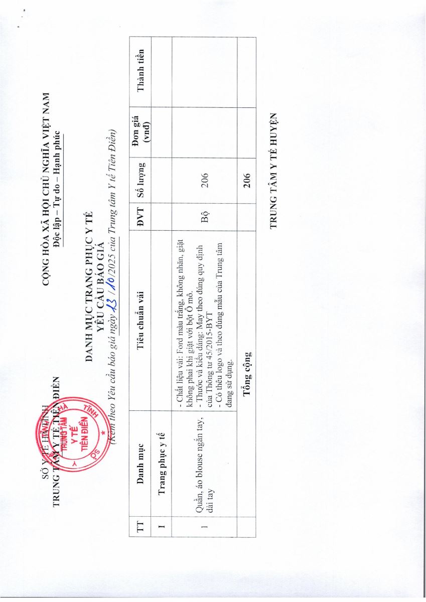 Trung tâm Y tế Tiên điền nhận báo giá danh mục trang phục Y tế